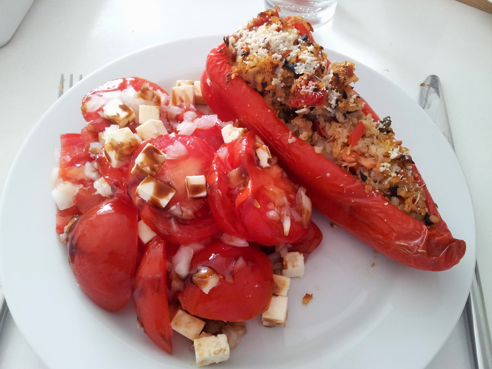 Kog bulguren efter anvisningen på emballagen og lad den køle lidt af. Hak løg, chili, oliven og kapers. Dræn tunen og plæk den fra hinanden. Bland bulguren med alle ingredienserne. Rengør peberfrugterne og fyld dem med fyldet og bag dem ved 200 grader i cirka 30 minutter. Drys med parmasanost og bag dem i endnu 10 minutter.